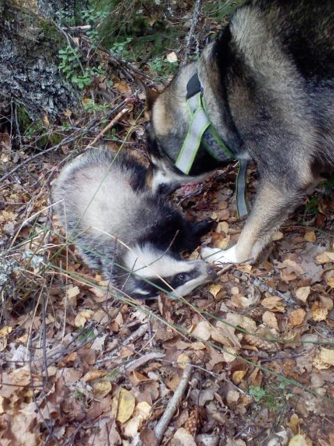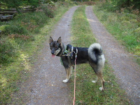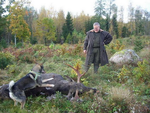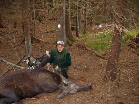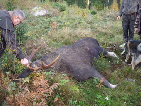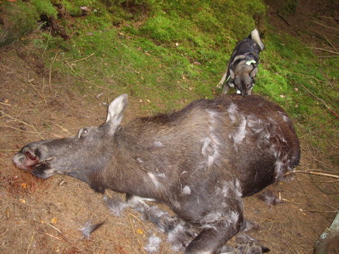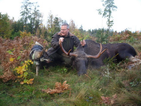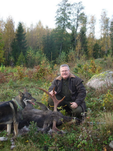 Vores stolte hundefører som måtte finde vores danske naboer´s elg. Elgen blev fundet på et 600 meter langt, 20 timer gammelt spor, da vores naboer (mod Sinnerbo)